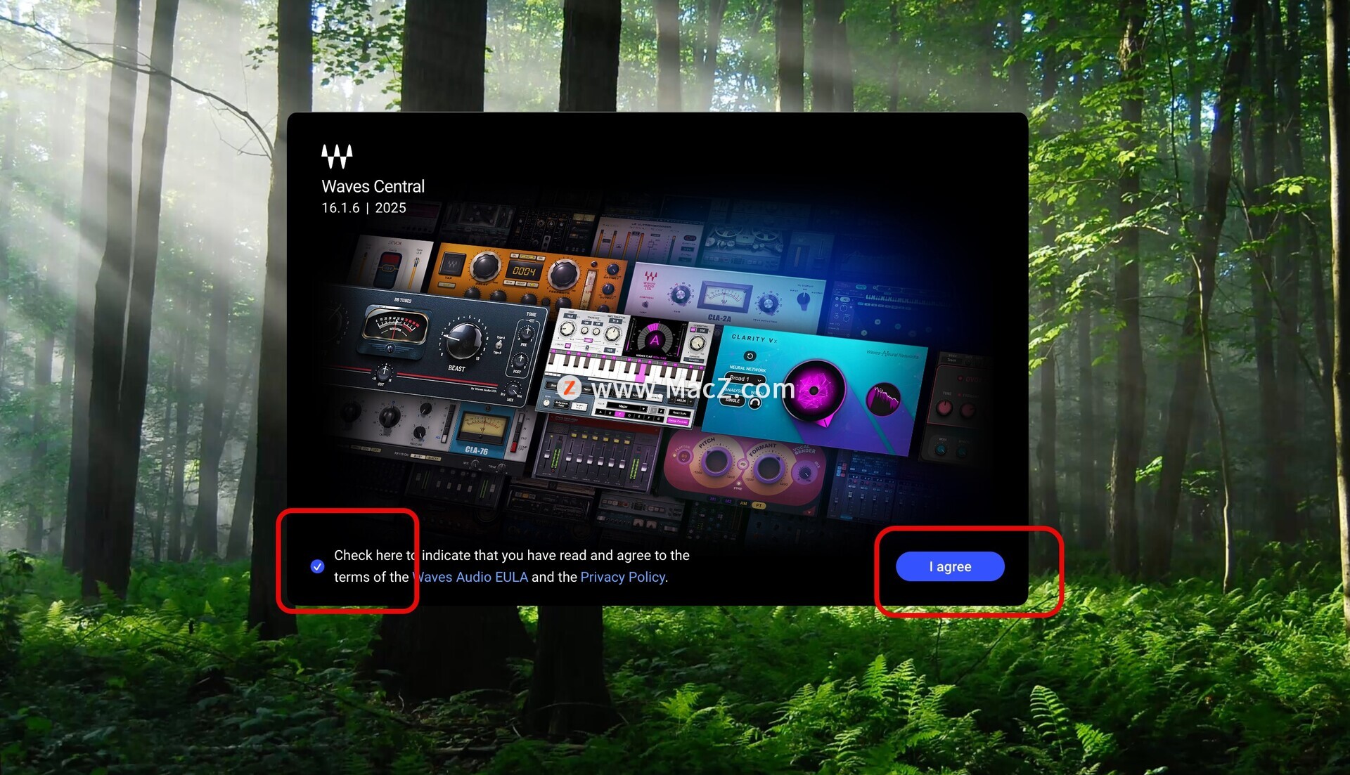 现在打开应用程序中安装好的【Waves Central】,接受许可,点击I Agree