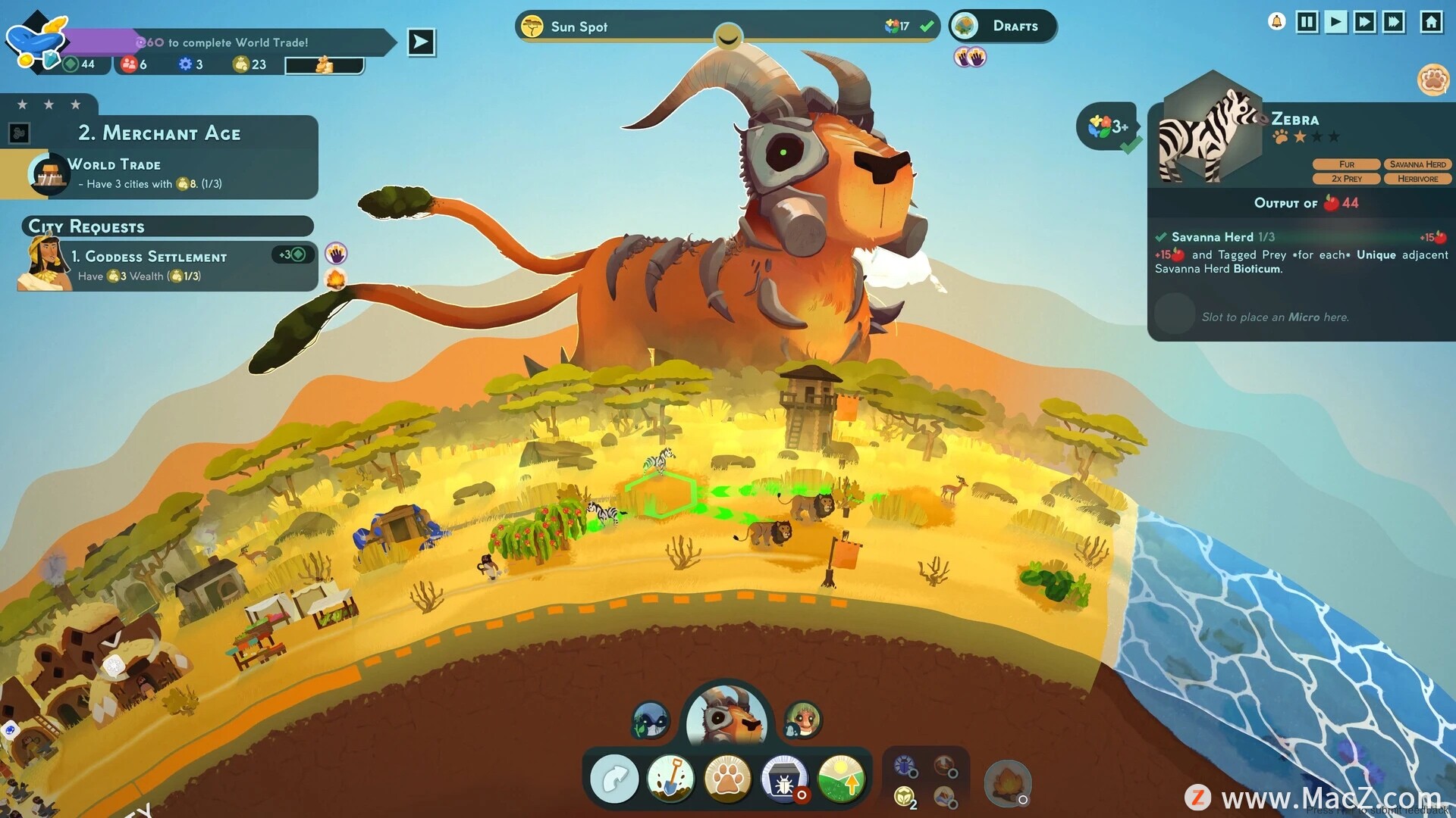 改造各种生物群落,巧妙地结合这些环境中特有的植物、动物和材料。通过不断尝试,你会发现哪些组合最符合居民的需求和目标,从而开启他们激动人心的新纪元。