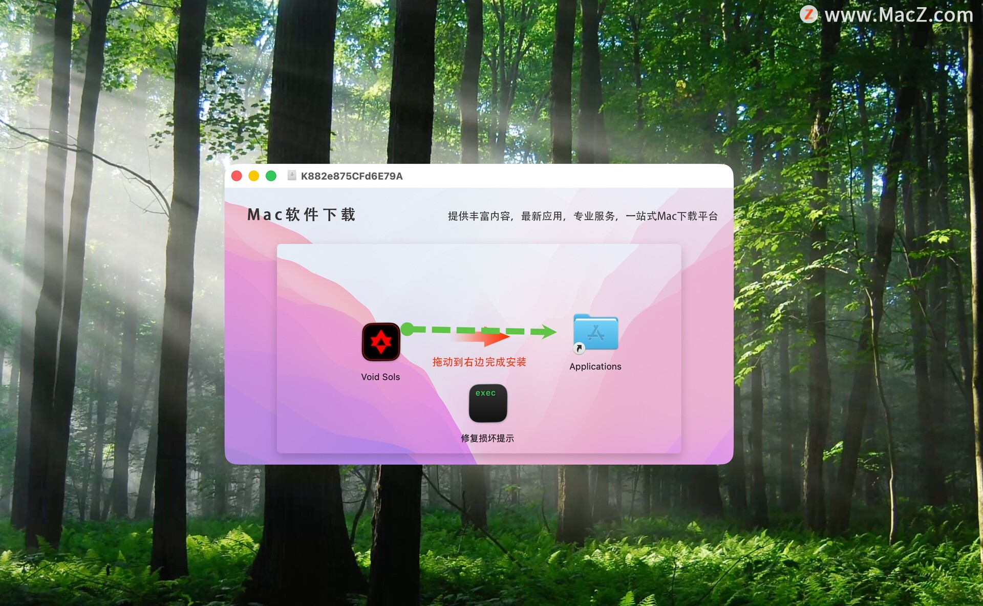 安装包下载完成后打开,将左侧文件拖动到右侧文件夹即可