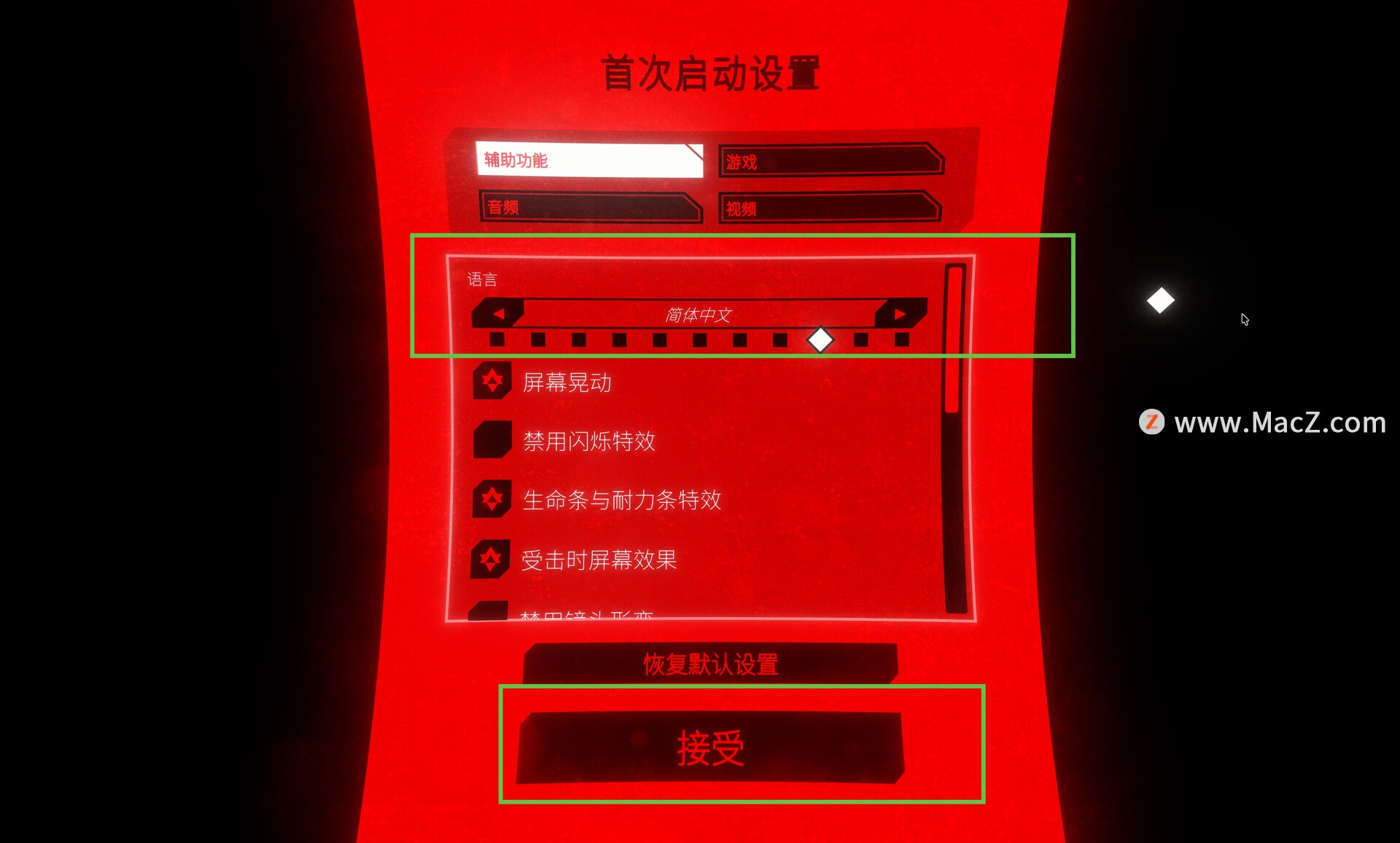 运行游戏,在Language处选择简体中文,点击接受即可,如图