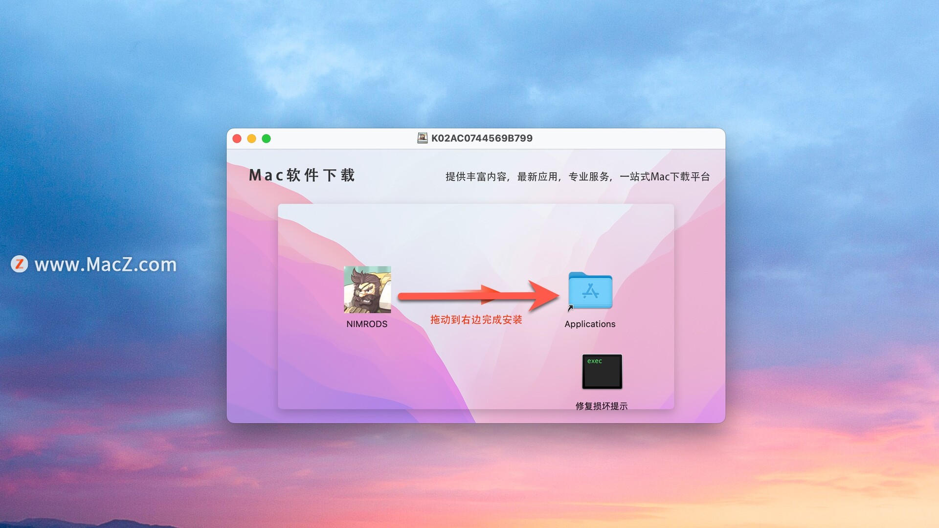 安装包下载完成后打开,将NIMRODS: GunCraft Survivor拖动到右侧文件夹中即可