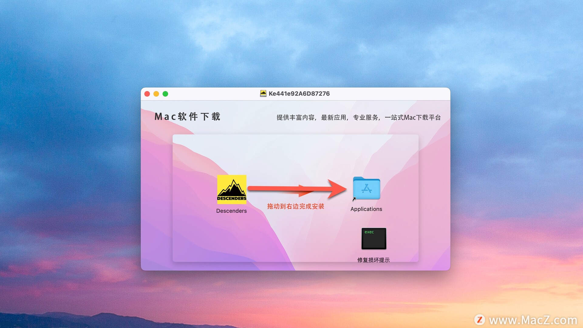 安装包下载完成后打开 ,将Descenders拖动到右侧文件夹中即可