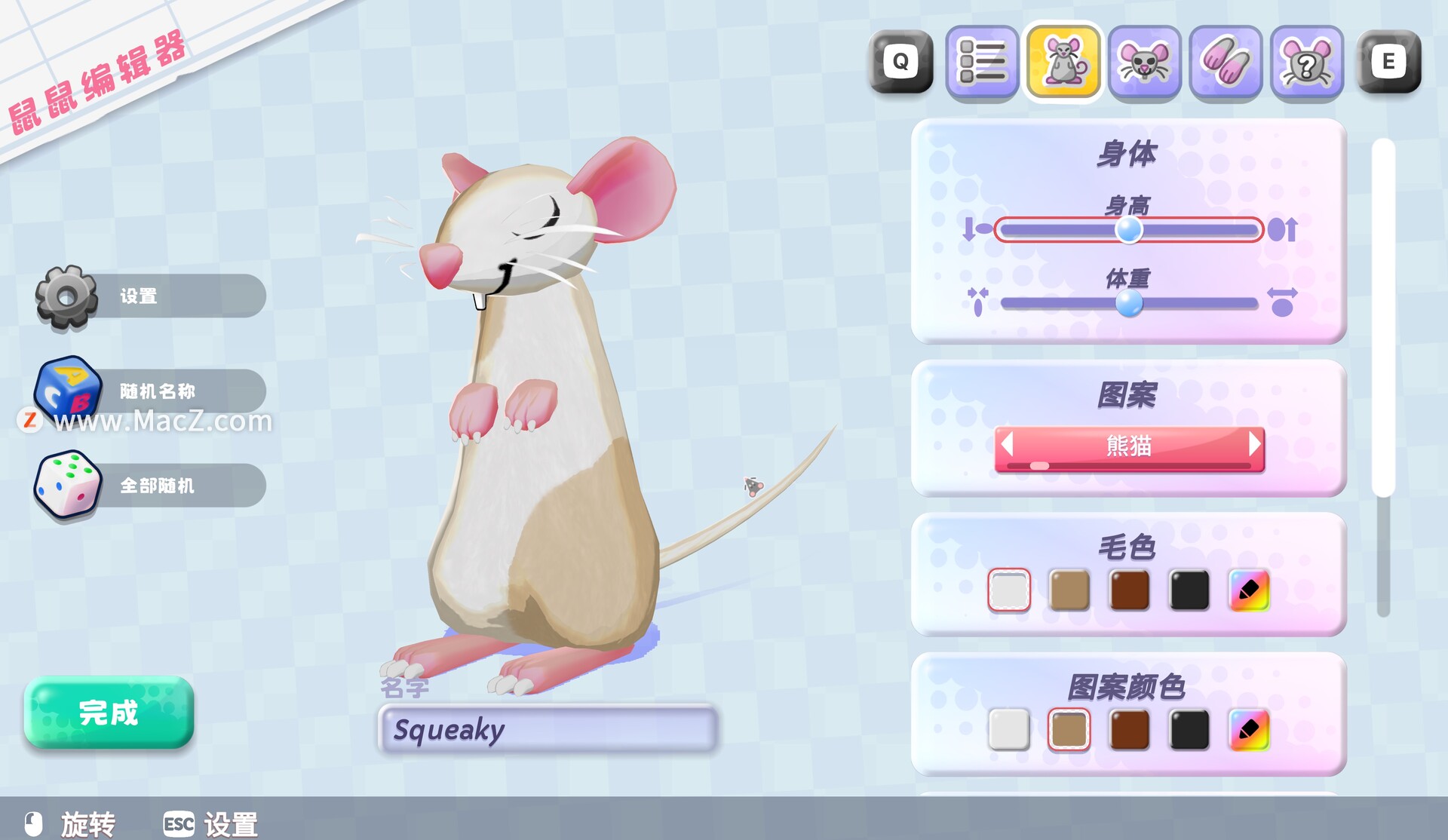 用世界上首款啮齿动物编辑器(我们觉得是吧?)打造你心仪的啮齿动物。从鼻子到尾巴,决定你想要什么样的朋友陪伴在你身边!