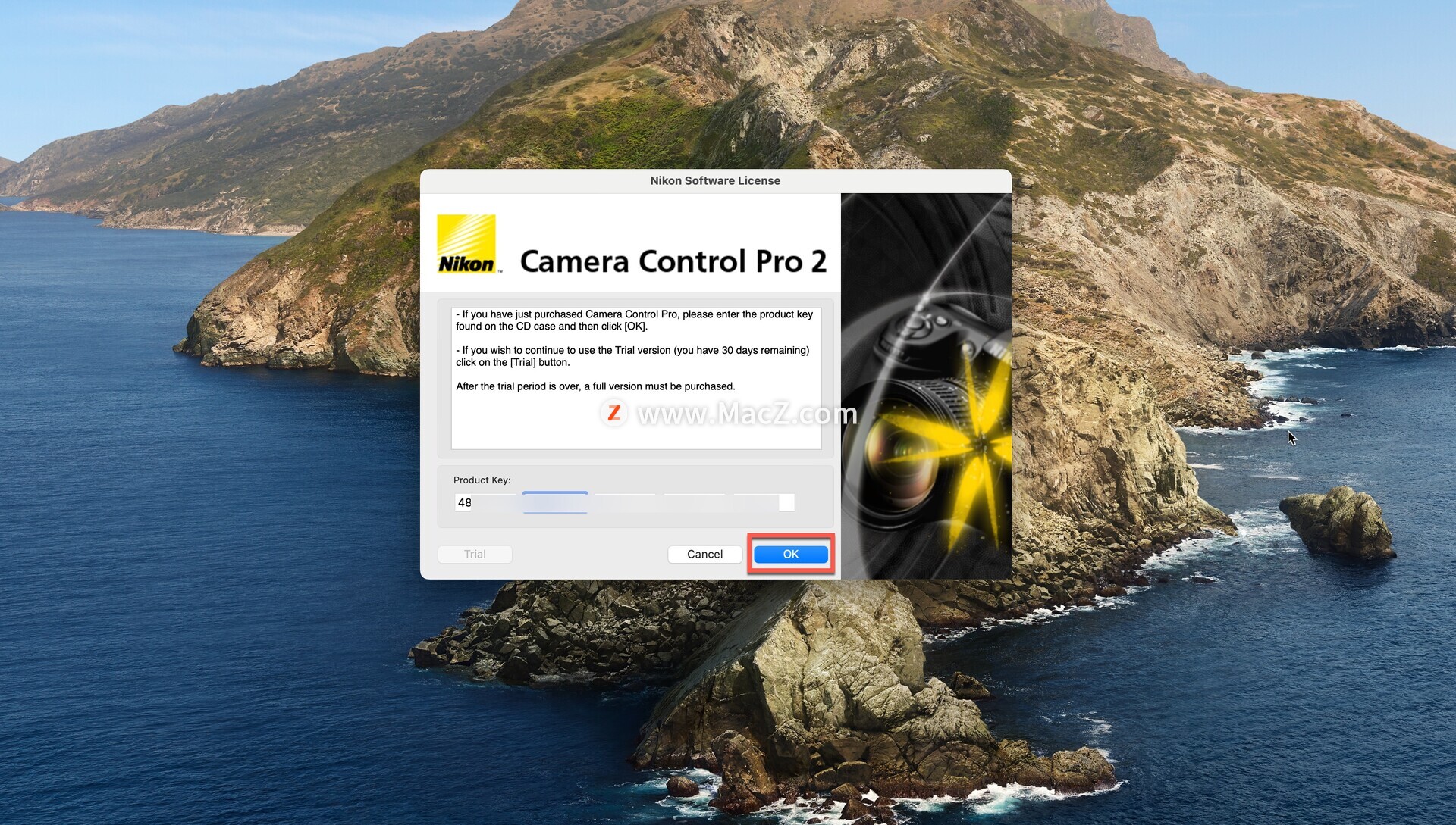 在nikon camera control pro 2注册界面输入注册码,然后点击OK即可!!!