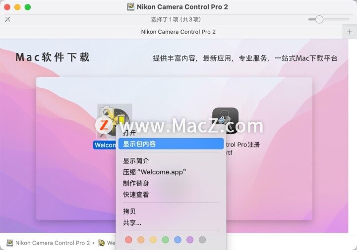 注意:如果安装Nikon Camera Control Pro 2软件失败,请右键-显示安装包内容-contents找到MacOS里面的文件打开安装,如图: