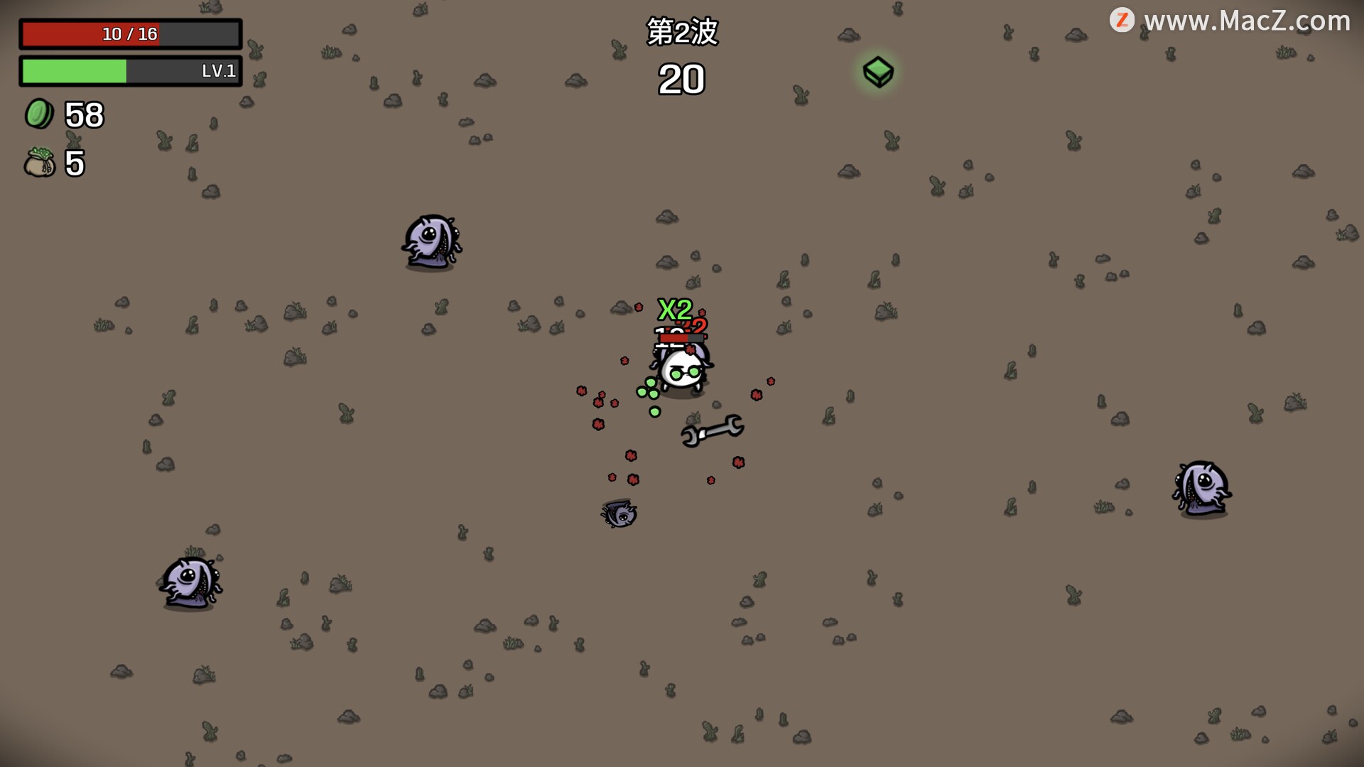 • 收集材料以获得经验,并在新一波敌人开始前在商店购买物品。
