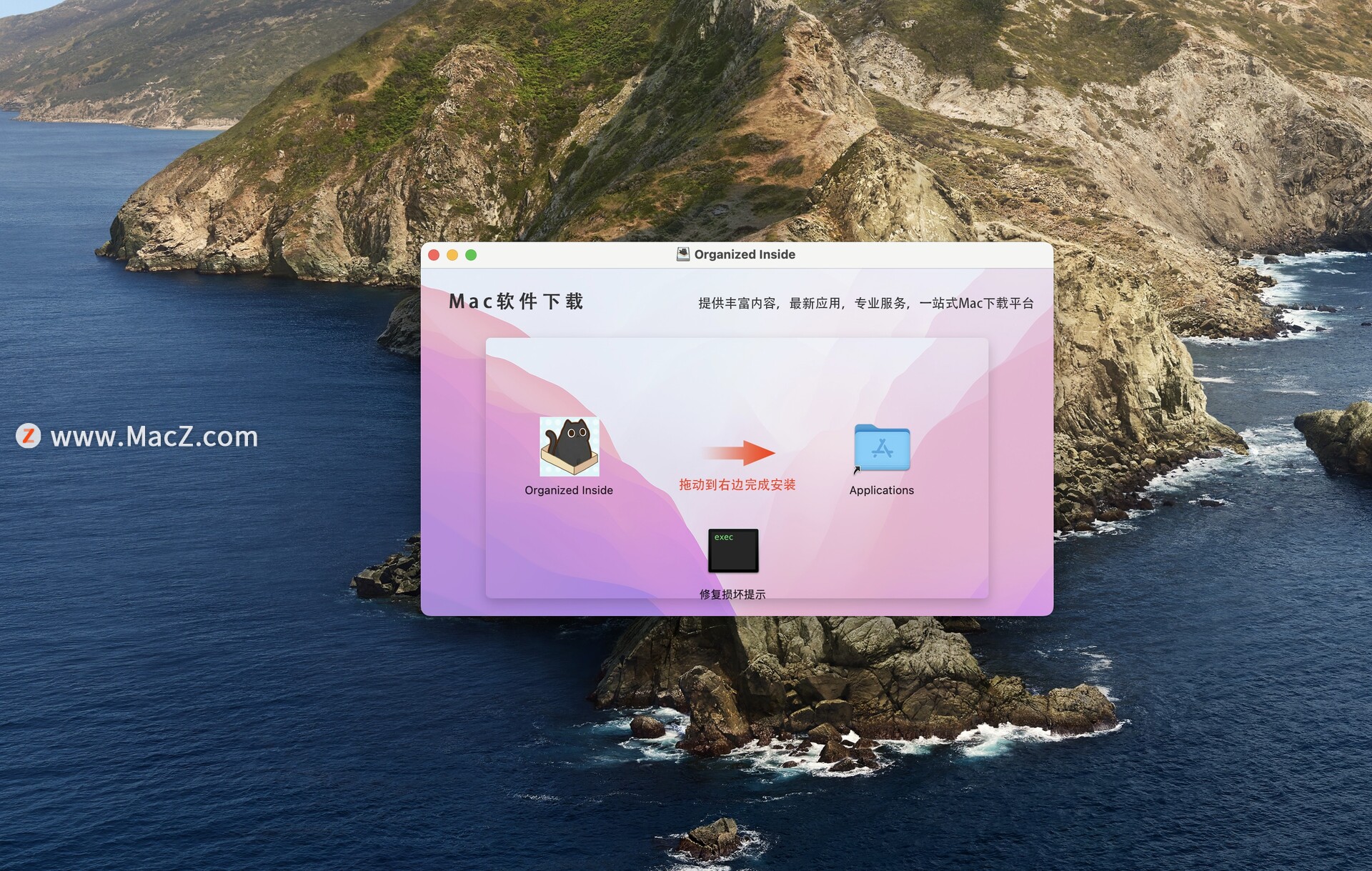 下载并打开,把左侧APP拖动到右侧应用程序文件夹中
