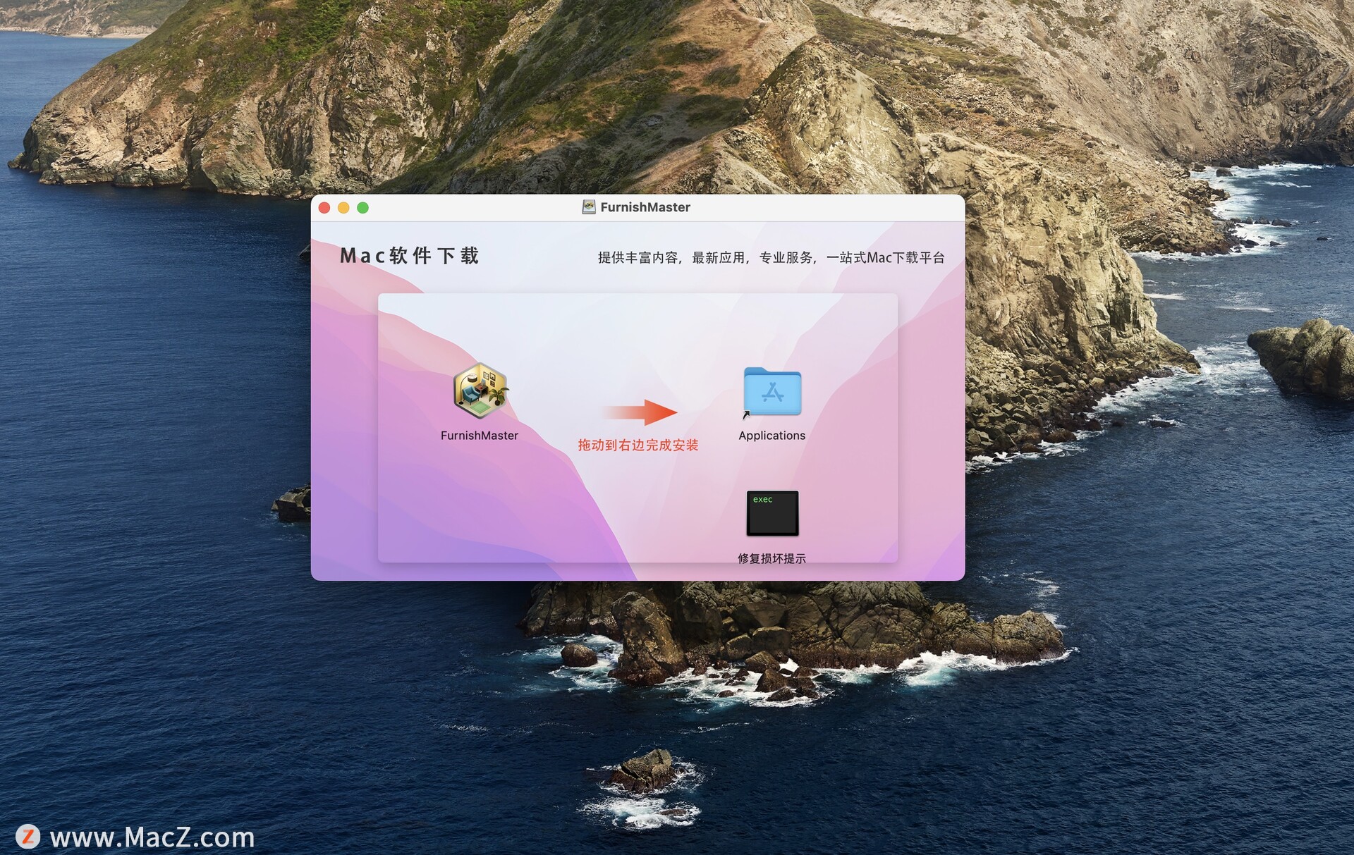 下载完成后,打开安装包,将左侧文件拖动到右侧文件夹即可。