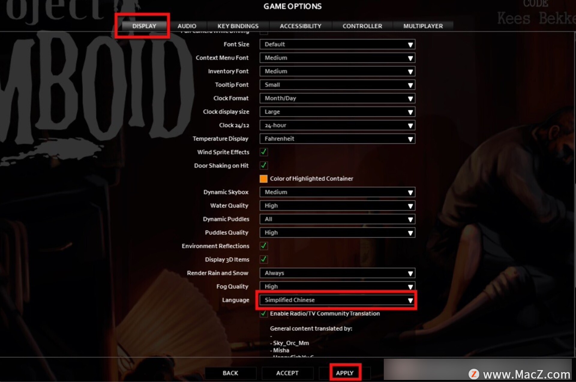 点击DISPLAY,在语言栏选择Simplified Chinese,最后点击APPLY即可设置成功。