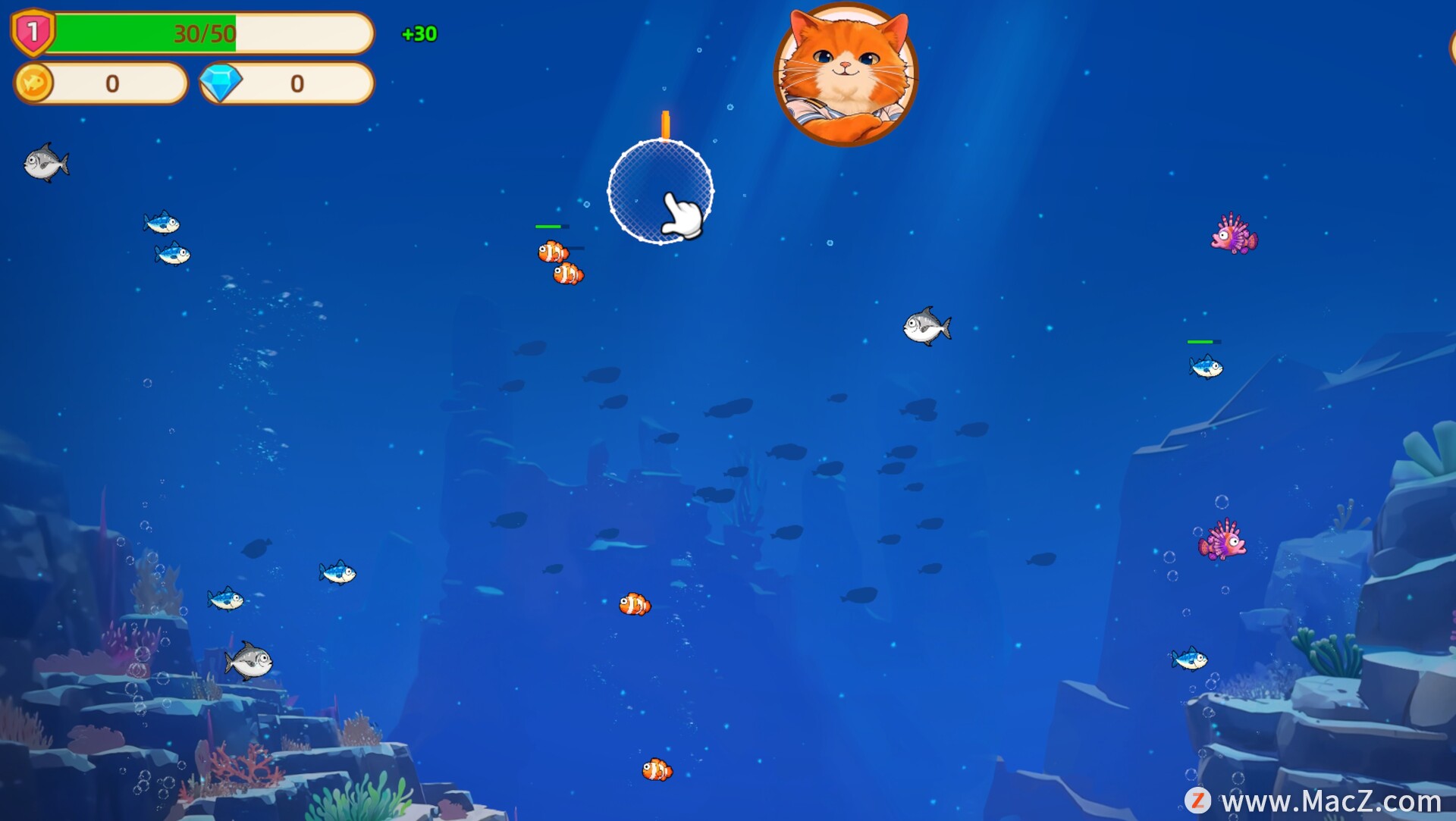 这是一款捕鱼主题的增量游戏,休闲、轻松、解压,单手即可游玩,将光标悬停在鱼群上即可自动捕鱼。你将与猫船长一起探索环球渔场,每次出海都将满载而归,你将振臂高呼“再来一局”!