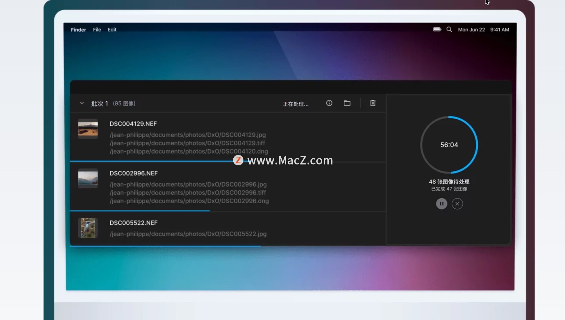 - DxO PureRAW 6 通过批量并行处理加速大批量工作流程,能够在上一张文件尚未完成时智能启动队列中的下一张。 这最大化利用了硬件性能,大幅缩短处理大批量 RAW 文件所需的时间,让高负载工作流程更快速、更流畅、响应更迅捷。