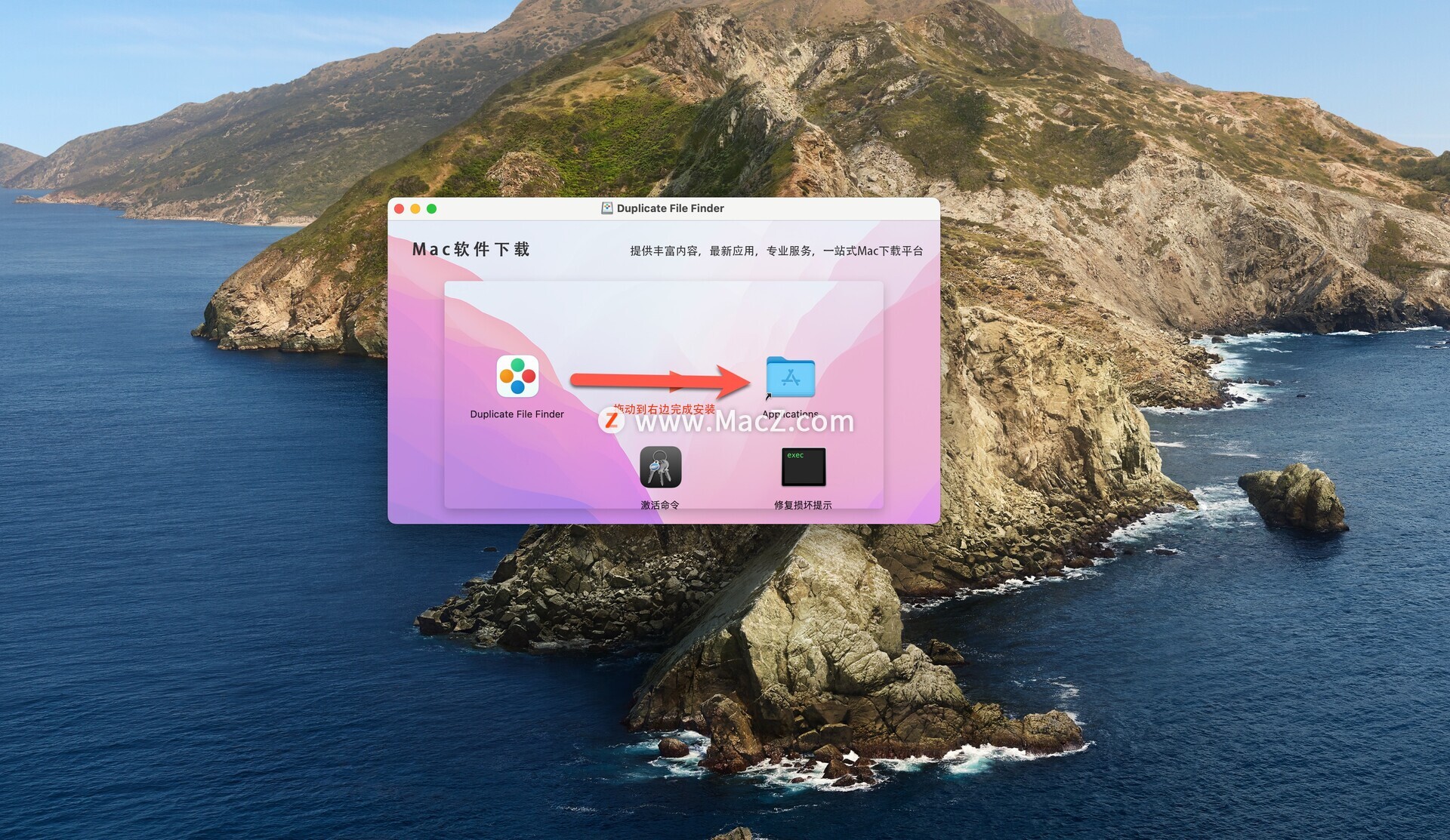 Duplicate File Finder下载完成后打开,拖动左侧的软件到右侧应用程序中即可
