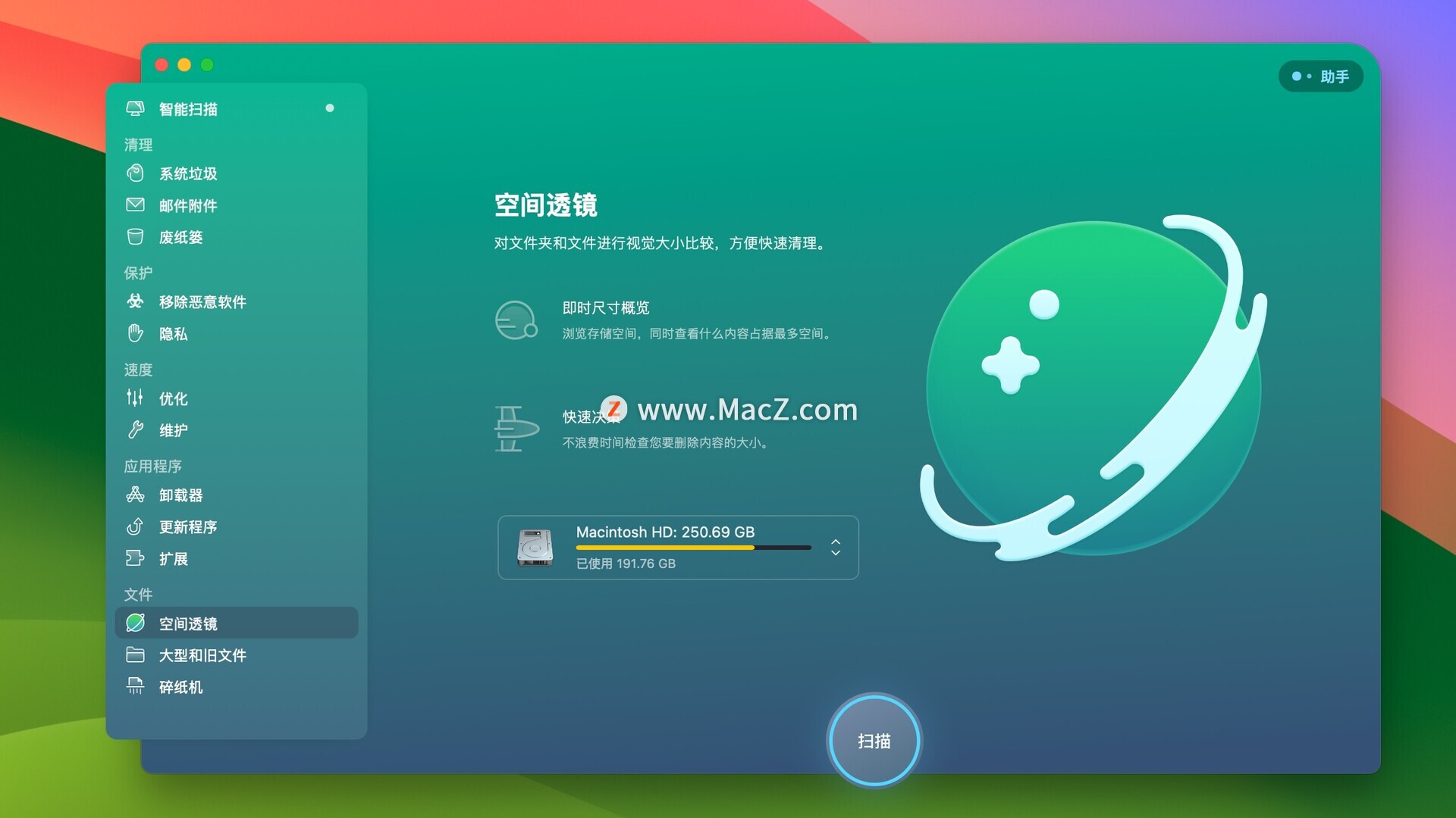 运行CleanMyMac X清理工具,然后在空间镜头中点击【扫描】就可以构建我们的存储图了。