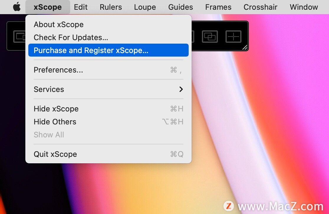 打开xScope 4,点击左上角【Purchase and Register xscope。。。】,弹出注册界面。