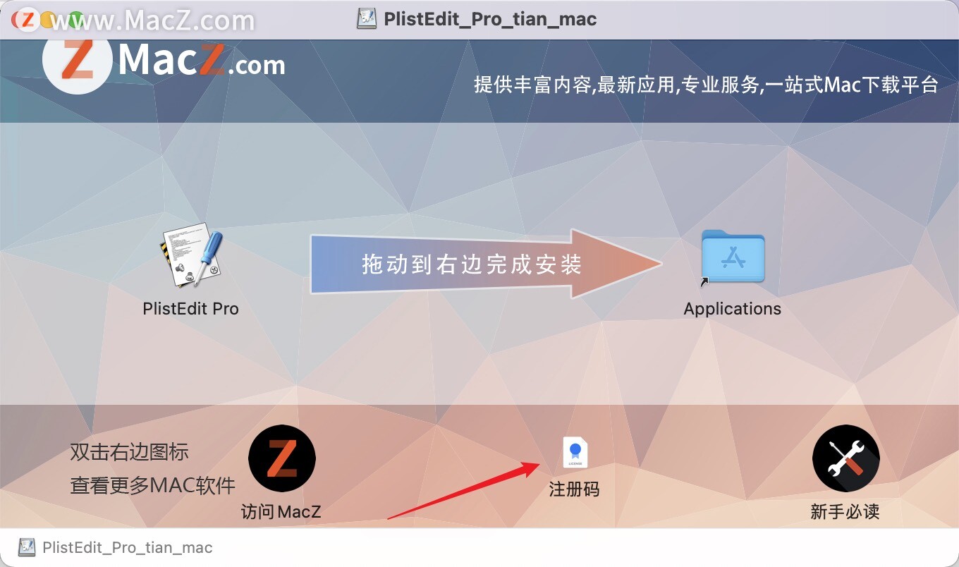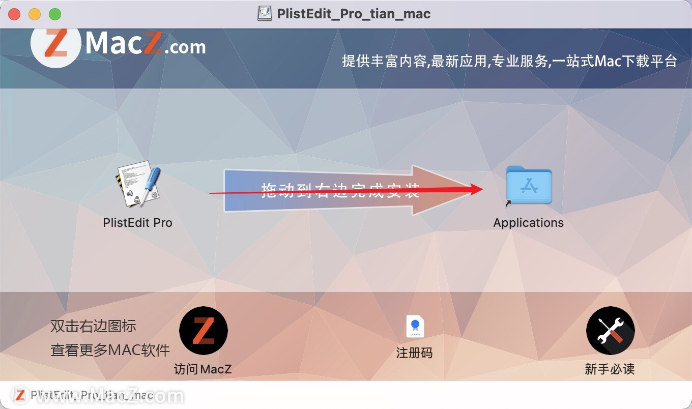 plistedit pro 破解版镜像包下载完成后,双击打开,将左侧的【plistedit pro】拉到右侧的应用程序即可使用!