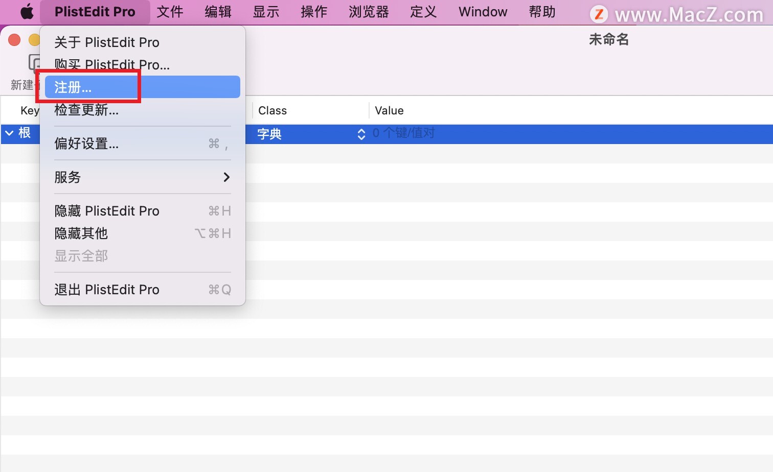 然后在应用程序中,打开plistedit pro mac破解版,在左上角点击【注册】。