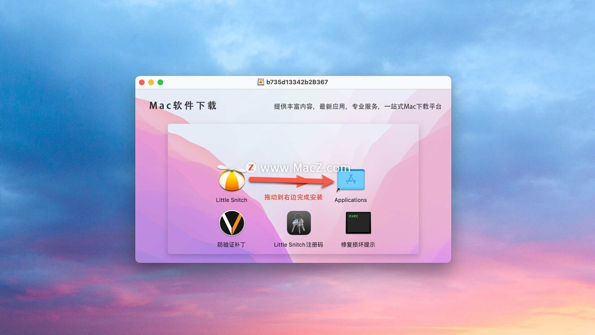 little snitch 5 破解版下载完成后打开,拖动左侧的软件到右侧应用程序中