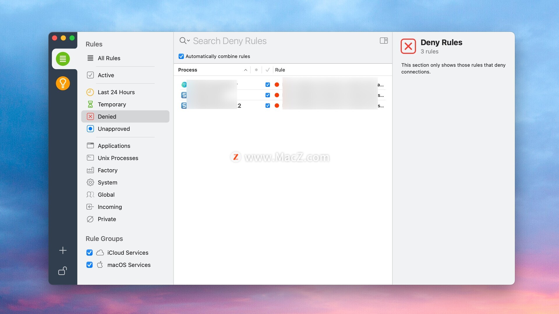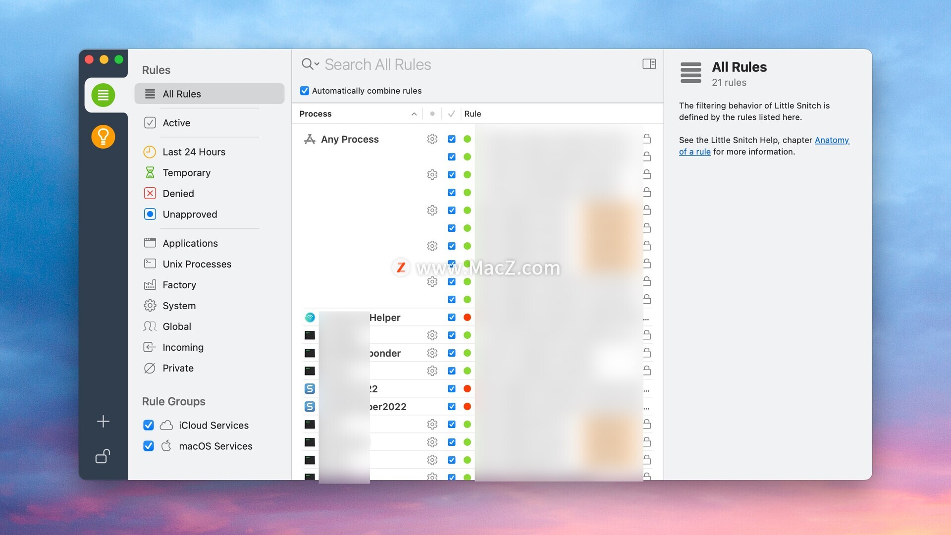 Little Snitch for Mac具有直观的界面和强大的功能,可以轻松地配置和控制网络规则。用户可以通过简单的拖放操作,将应用程序添加到白名单或黑名单中,以便控制网络访问权限。它还支持自动规则和手动规则,让用户能够根据需要灵活地配置网络规则。