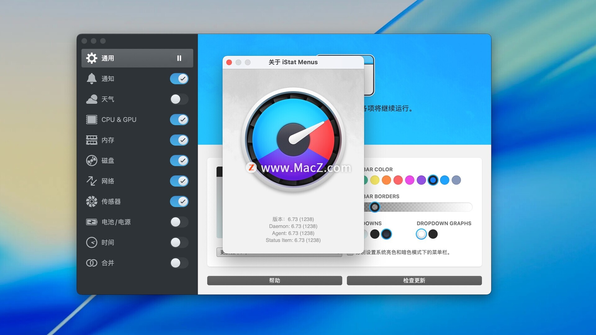 除了更易于呈现主题外,iStat菜单6还引入了新的方法来对菜单栏图标,菜单下拉菜单和图表进行着色和设置。如果您希望您的菜单下拉菜单与macOS匹配,我们还添加了对明亮和黑暗充满活力的菜单下拉背景的支持。