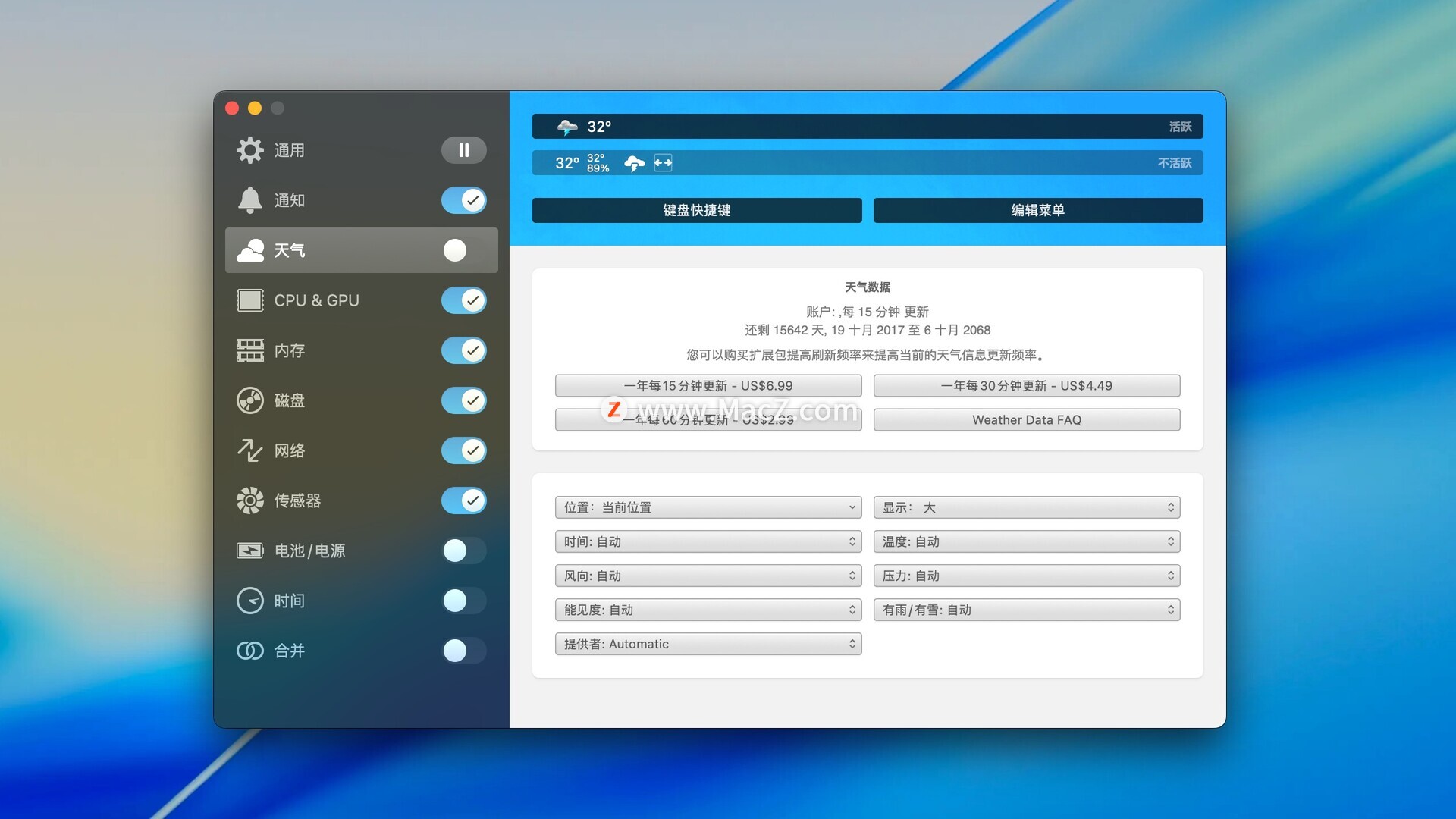 快速浏览菜单栏中的当前情况,或深入了解令人难以置信的小时预报和每周天气概况,涵盖低温和高温,风速和风向,下雨的机会,湿度,露点,紫外线指数,压力,能见度等等。 。iStat菜单可以根据您当前的位置或几乎世界上任何城市显示天气。