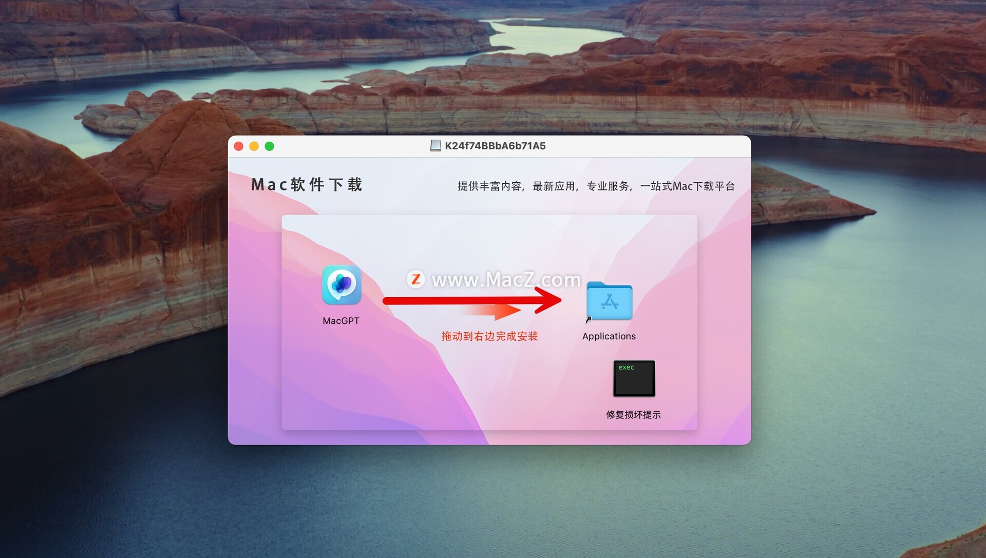 下载完成后,打开安装包,将左侧的软件拖动到右侧应用程序即可。