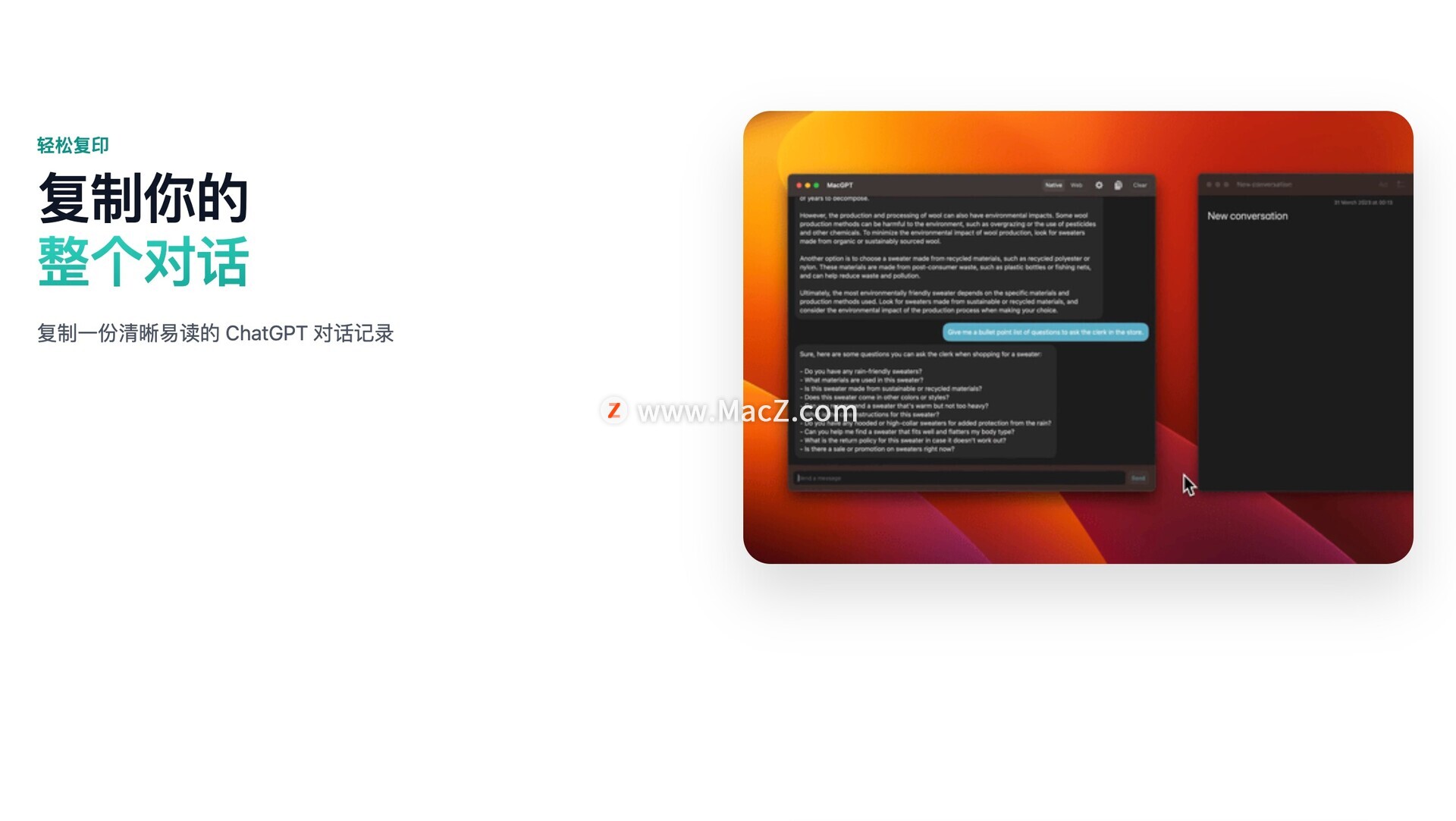 - 对话内容一键复制:MacGPT支持一键复制与ChatGPT的所有对话内容,方便用户随时保存或分享重要信息。
