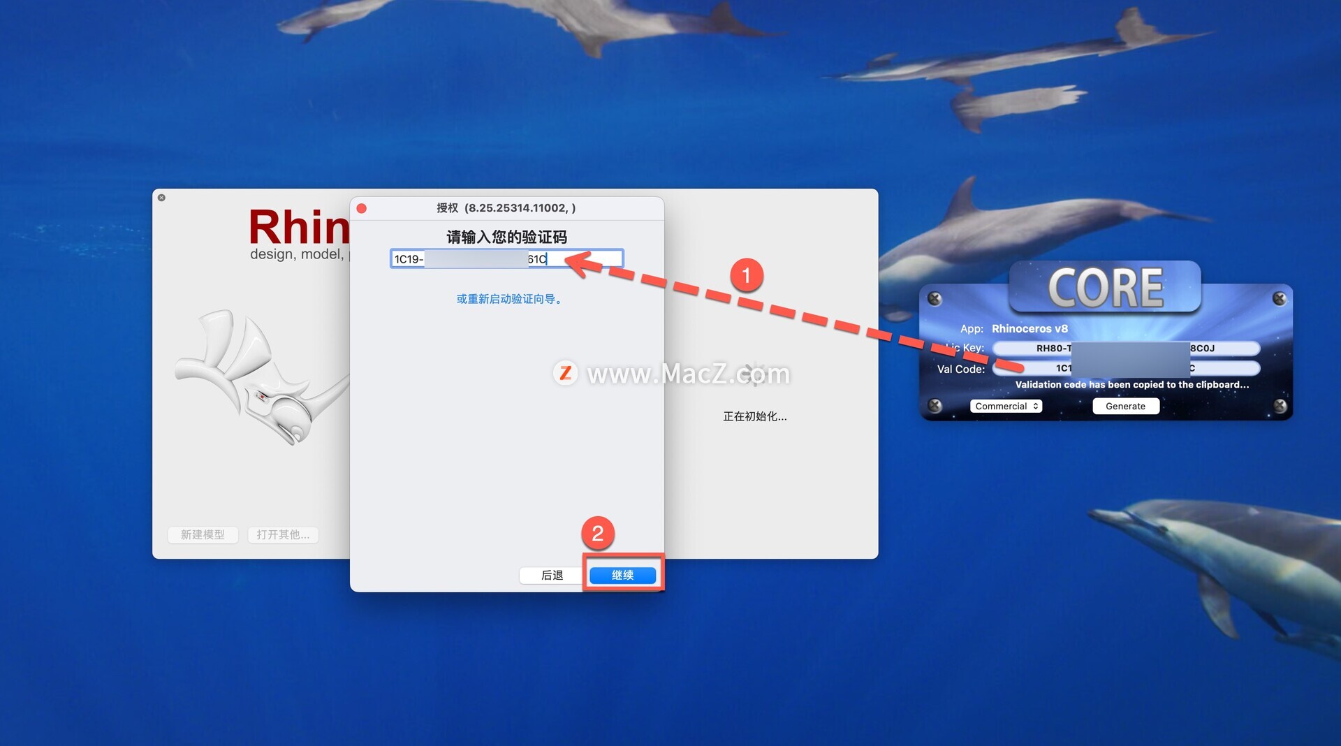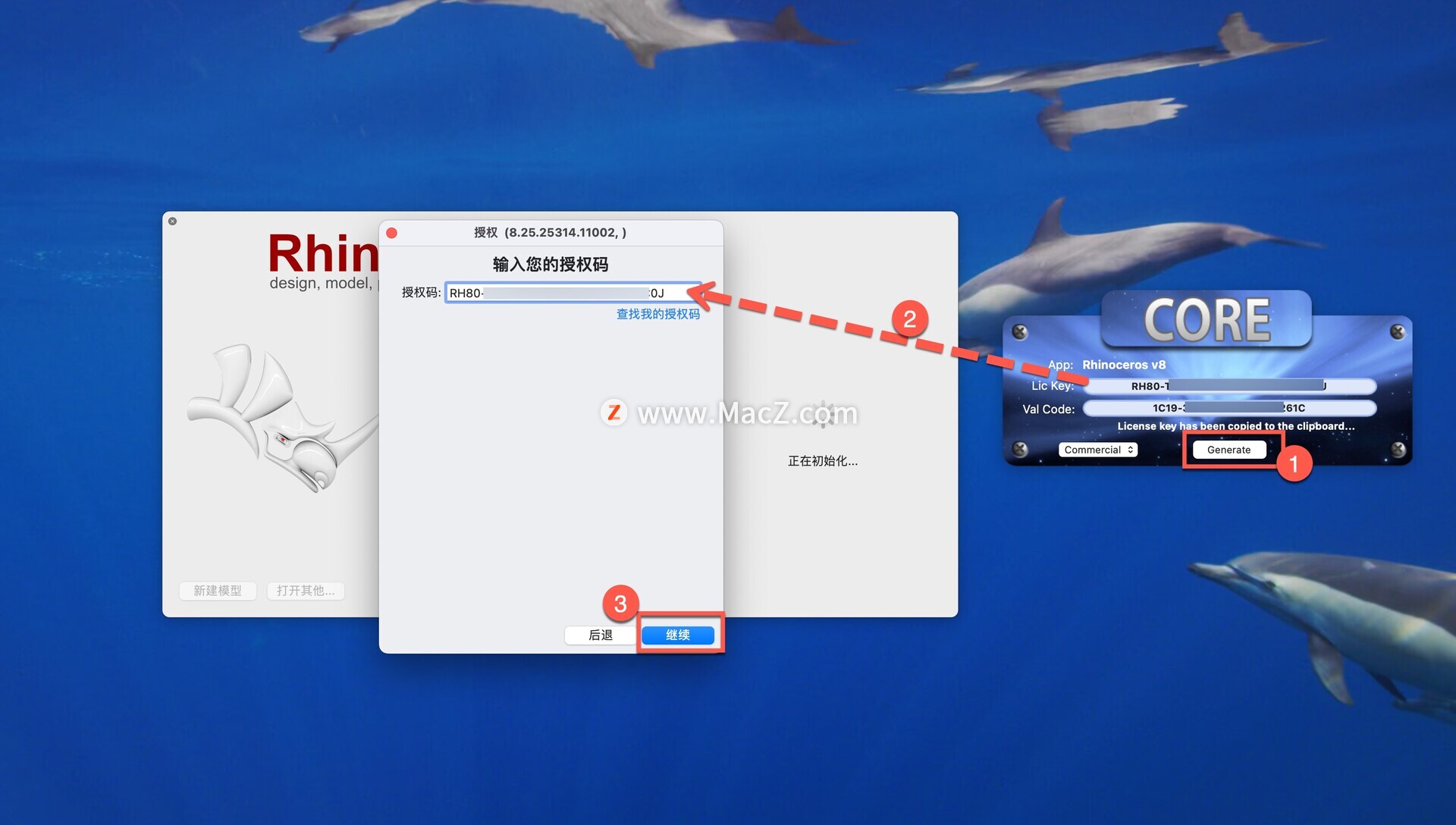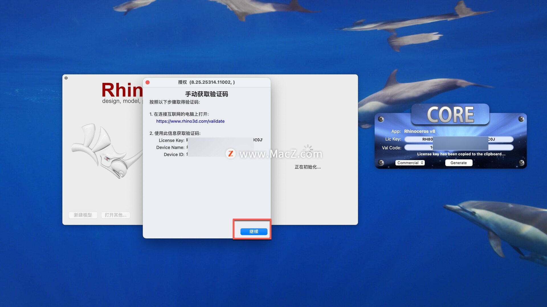 点击注册机的 Generate生成授权码和秘钥,把授权码粘贴到软件对应的位置,再点击 继续,如图: