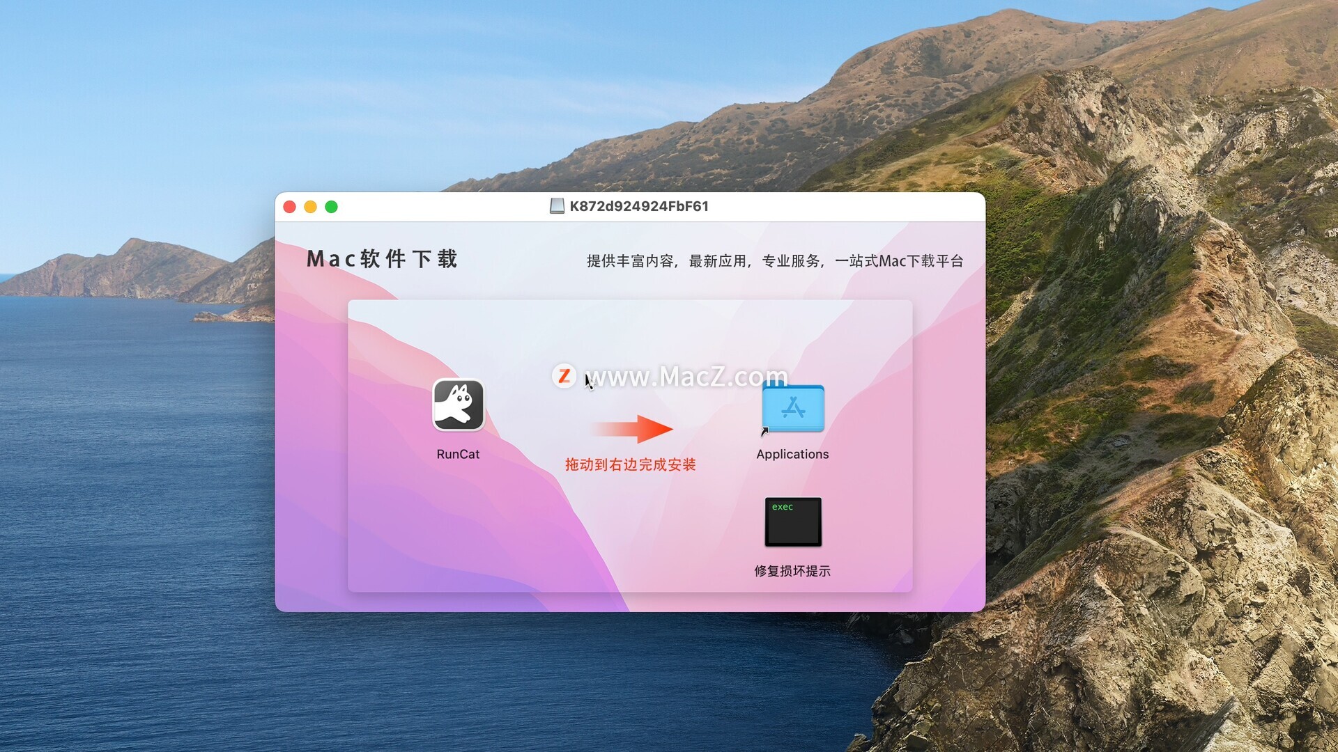 安装包下载完成后打开,拖动左侧的RunCat到右侧应用程序