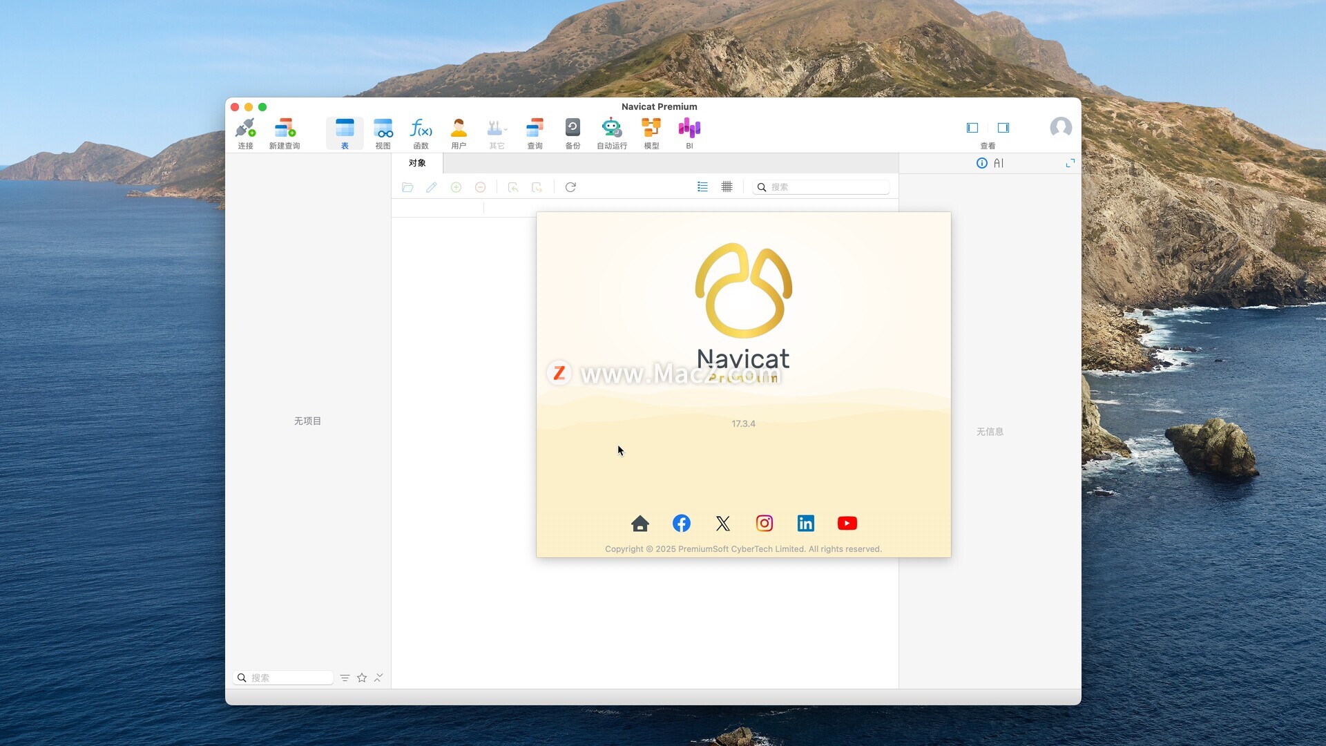Navicat Premium for Mac是一款专业的数据库管理工具,适用于开发人员、数据库管理员和分析师等用户。它提供了强大的数据管理功能和丰富的工具,使用户能够轻松地管理和维护数据库,提高数据处理效率。测试环境:MacOS 13.7.6