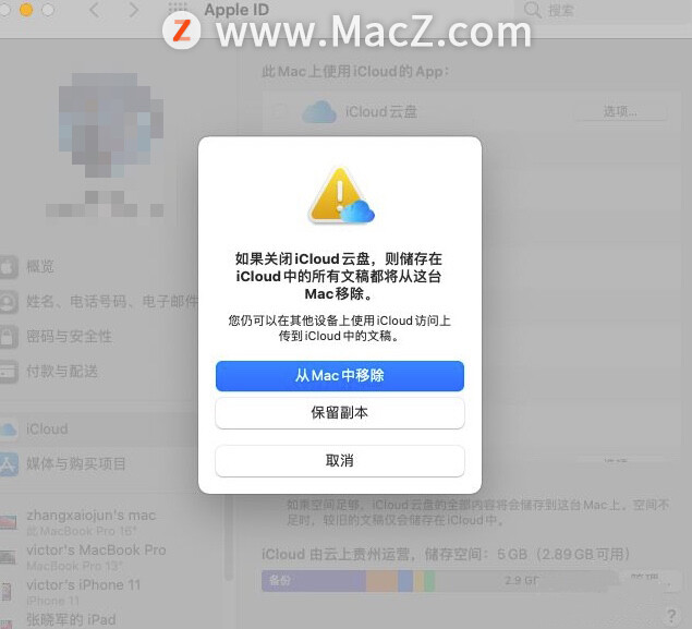 4、会弹出“如果关闭iCloud云盘,则储存在iCloud中的所有文稿都将从这台Mac移除”的提示,