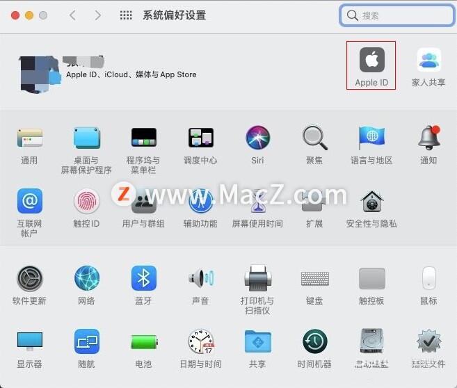 2、在偏好设置界面,点击右上角的Apple ID;