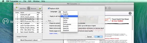 您需要在OCR转换之前选择正确的文档语言。这是获得准确的文本识别结果非常重要的一步。该应用程序支持10种语言,包括英语,德语,法语,意大利语,西班牙语,葡萄牙语,波兰语,瑞典语,俄语和荷兰语。